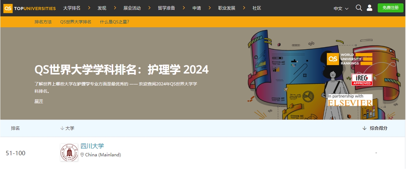 Recently, The international higher education consultancy firm QS (Quacquarelli Symonds) released World University Rankings by Subject 2024, and Sichuan University Nursing entered the top 100 globally for the first time.