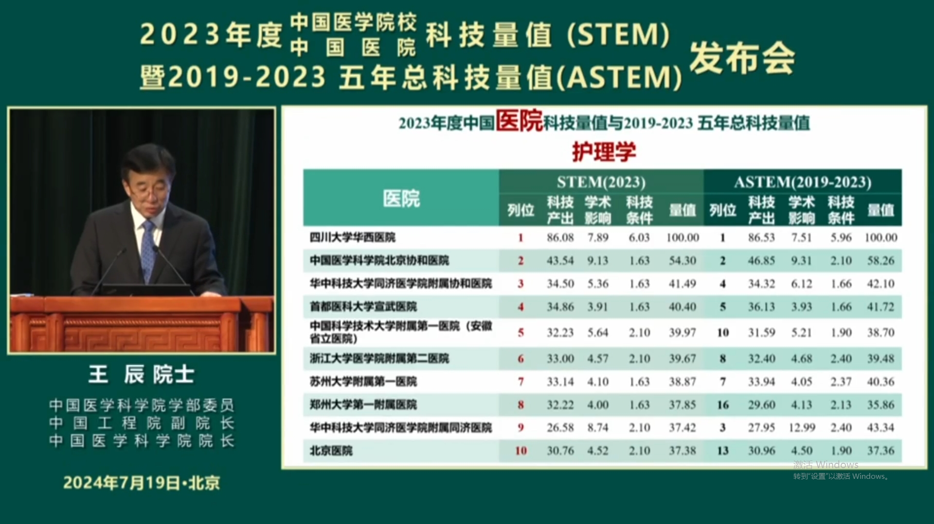 On July 19, 2024, 2023 China Medical College/Hospital Science and Technology Evaluation Metrics (STEM) and 5-year Accumulative Science and Technology Evaluation Metrics(ASTEM) ranking for 2019-2023 were released officially. West China Hospital, Sichuan University has stayed at the top of the overall ranking for consecutive 11 years. Nursing Discipline of our hospital ranked first on 2023 China Hospital STEM ranking on Nursing. So far, Nursing Discipline of our hospital has stayed at the top of STEM for consecutive 8 years.