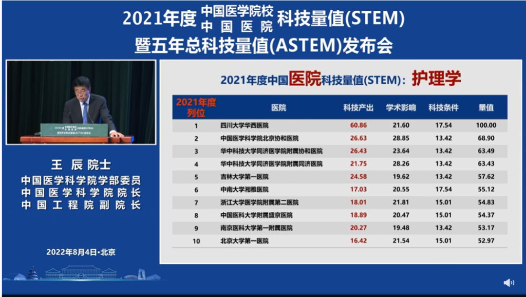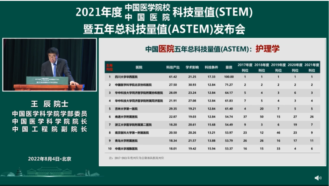 On August 4, 2022, China Medical College/Hospital Science Hospital Science and Technology Evaluation Metrics (STEM) and 5-year Accumulative Science and Technology Evaluation Metrics(ASTEM) ranking were released officially. West China Hospital, Sichuan University stayed at the top of the overall ranking for consecutive 9 years, and 15 disciplines stayed at the top three positions. Nursing discipline of our school ranked the first on 2021 STEM and the 5-year ASTEM. So far, nursing discipline of our school has stayed at the top of STEM for consecutive 6 years.
