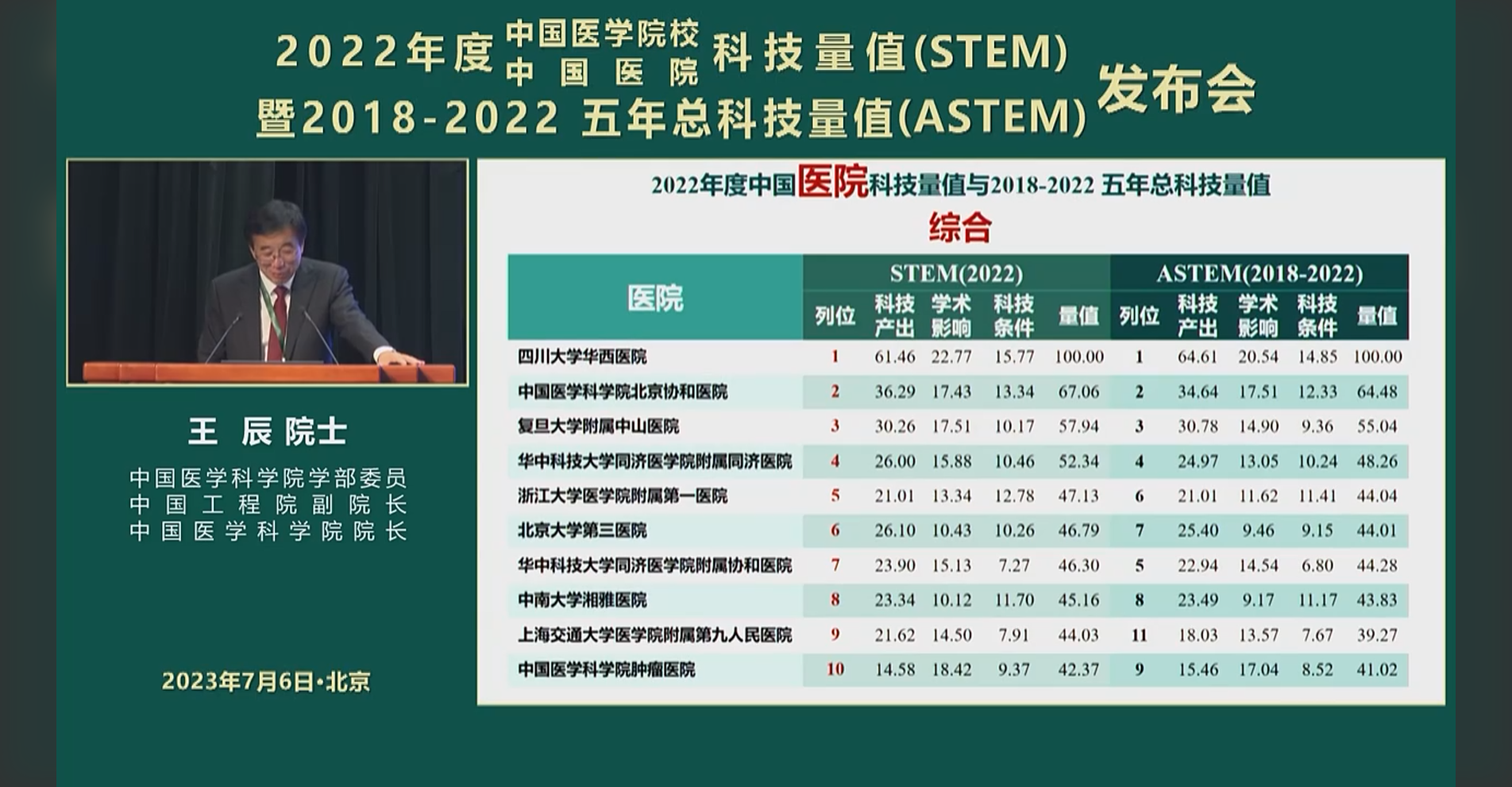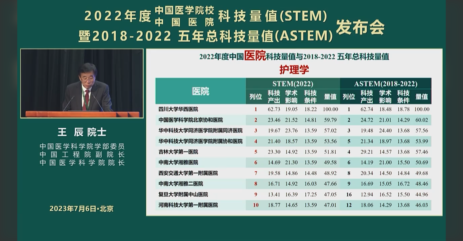 On July 6, 2023, 2022 China Medical College/Hospital Science Hospital Science and Technology Evaluation Metrics (STEM) and 5-year Accumulative Science and Technology Evaluation Metrics(ASTEM) ranking for 2018-2022 were released officially. West China Hospital, Sichuan University has stayed at the top of the overall ranking for consecutive 10 years, and 6 disciplines stayed at the top position. Nursing Discipline of our school ranked first on STEM. So far, Nursing Discipline of our school has stayed at the top of STEM for consecutive 7 years.