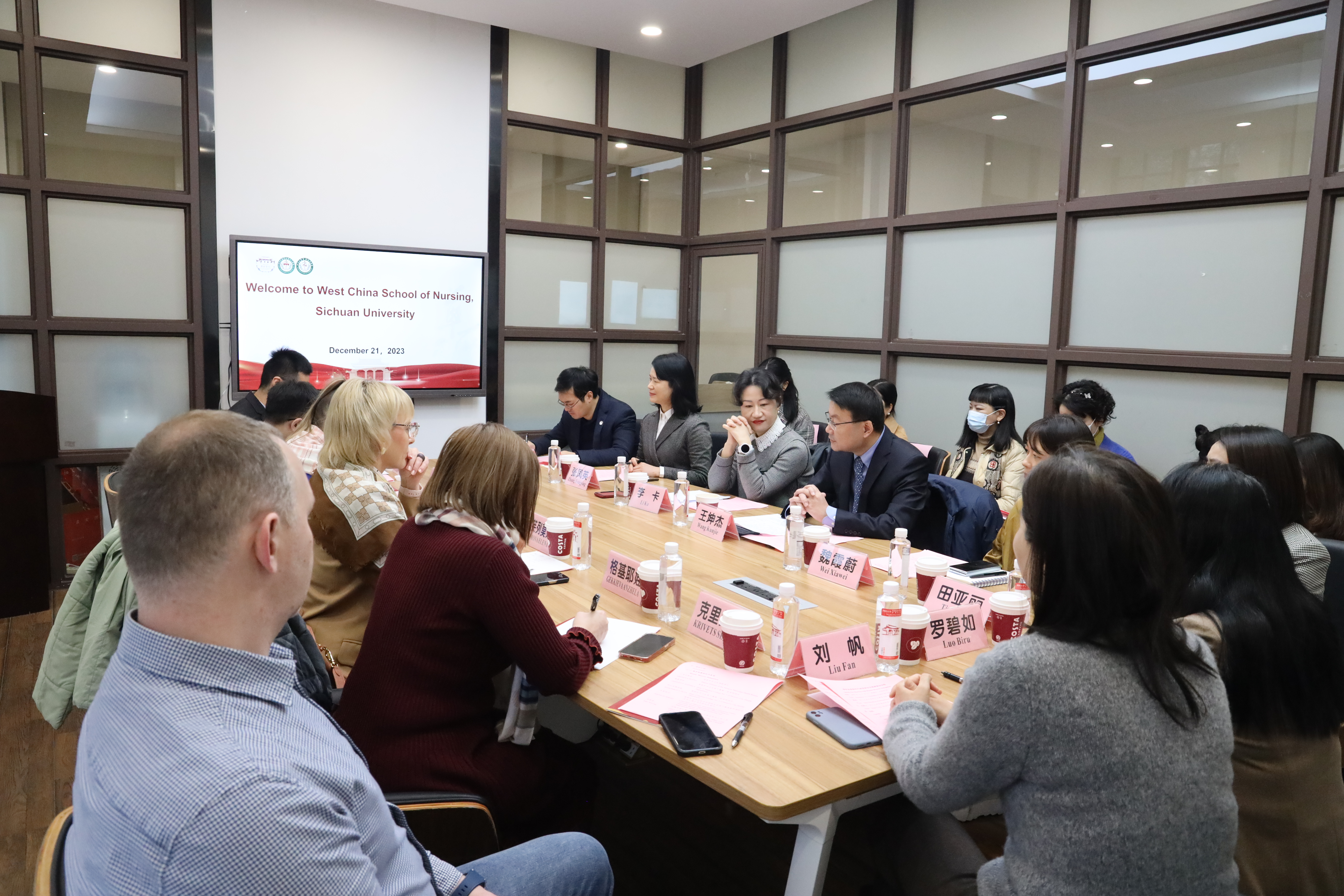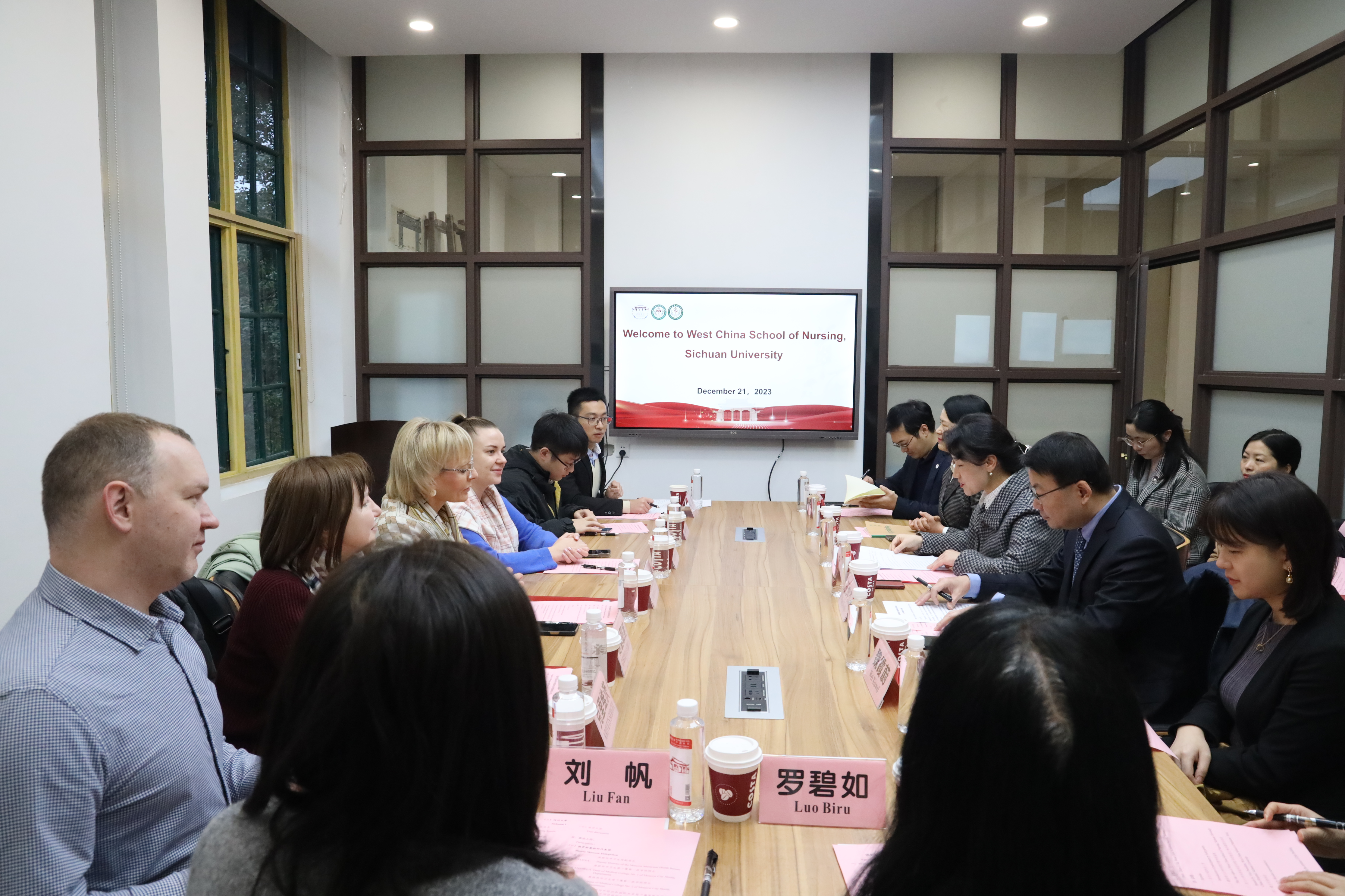 On December 21st, the Moscow City Health Department Delegation of Russia including Deputy Director Eremova Elena of Moscow City Health Department, President Gekkieva Anzhela of Medical College No.1 and President Alekperova Olga of Medical College No.2 of Moscow City Health Department, and Consultant Sergey Krivets of Moscow International Cooperation Center of Moscow City Department of Foreign Economic and International Relations, accompanied by Consultant Xiao Xinxing from the Asia-Africa Division of the Office of the Foreign Affairs Commission of Chengdu Municipal Committee, visited our school. Professor Wang Kunjie, Vice President of West China School of Medicine/ West China Hospital, Sichuan University, Professor Wei Xiawei, Director of International Exchange and Cooperation Office, nursing teacher representatives of School of Nursing and affiliated hospitals attended the meeting. The meeting was moderated by Professor Li Ka, Dean of West China School of Nursing, Sichuan University.