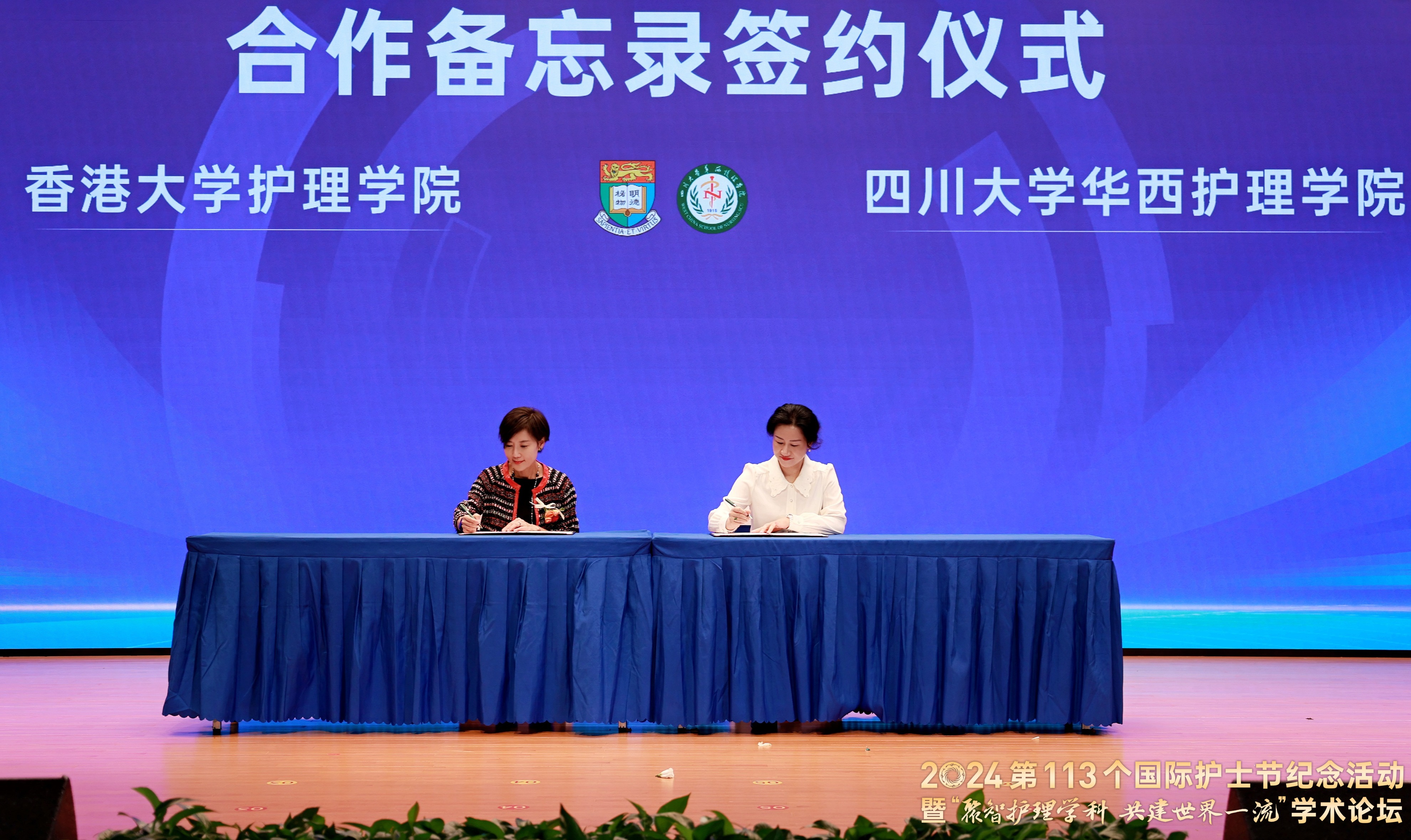 Dean Luo Fengming of West China School of Medicine/West China Hospital of Sichuan University, Deputy Director Yuan Wen of International Office / HK,MC and TW Office of Sichuan University, Professor Doris Sau Fung Yu and Senior Lecturer Polly Siu Ling Chan from School of Nursing of LKS Faculty of Medicine of The University of Hong Kong witnessed the signing ceremony.