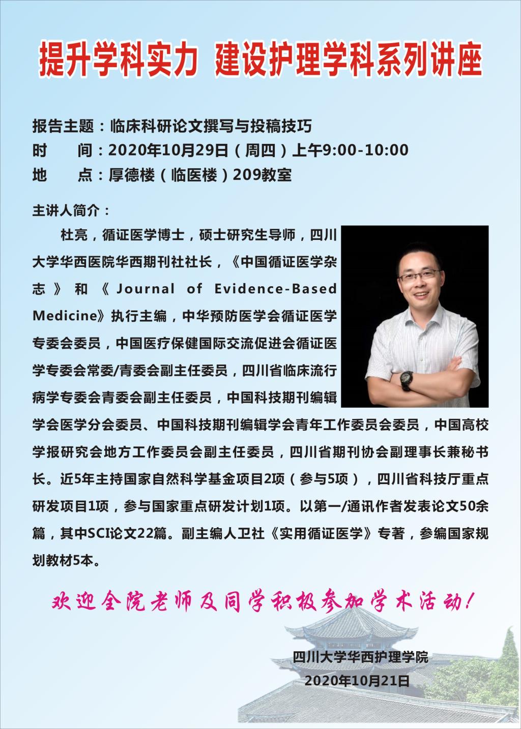 2020年10月29日讲座预告-《临床科研论文撰写与投稿技巧》、《...