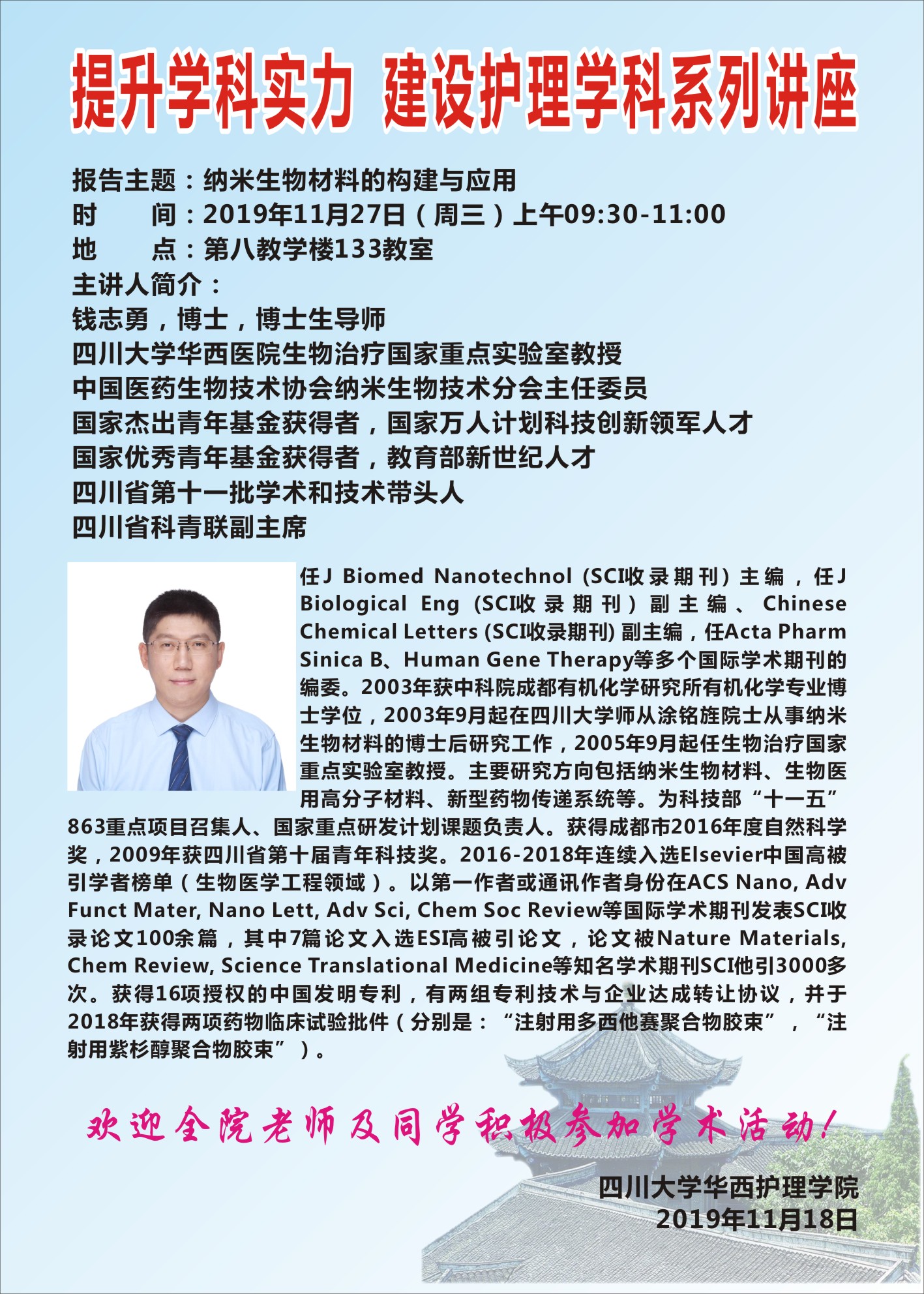 2019年11月27日讲座预告——“纳米生物材料的构建与应用”