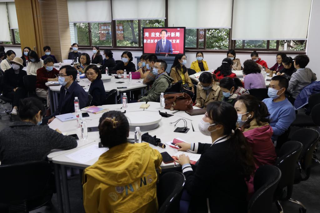 为进一步加强对《关于加快医学教育创新发展的指导意见》解读,促进文件精神的深入学习,全国医学教育发展中心、全国医学院校教师教学发展联盟于10 月14 日9:00-10:30在线举办“医学教育大讲堂”(第一讲)。我院组织研究生导师、教研室主任、课程负责人、教学骨干、本科生及研究生班主任100 余人集中在厚德楼214智慧教室集中观看学习,会后进行主题讨论。