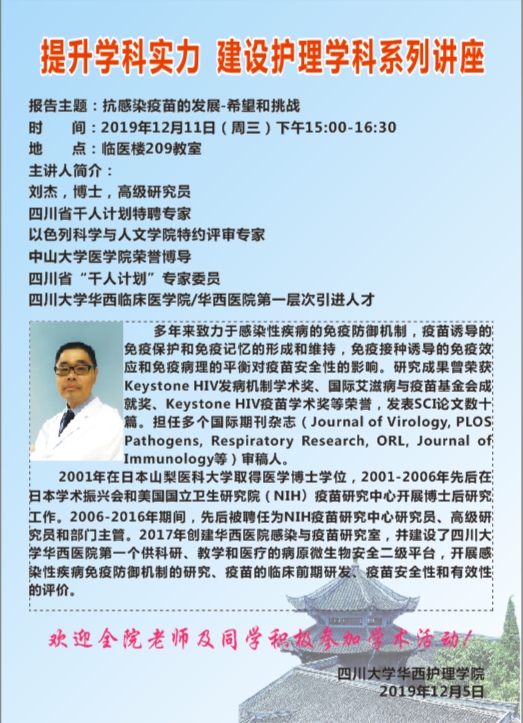 2019年12月11日讲座预告——“抗感染疫苗的发展-希望和挑战”