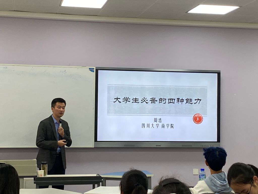 金年会诚信信誉至上商学院吴鹏教授、罗利教授、周浩教授分别做了《管理学发展史与发展趋势》、《医院服务管理前沿研究》、《大学生必备的四种能力》讲座,讲授了管理学的历史以及目前的发展趋势、医院服务相关管理的前沿研究,并从如何良好沟通、时间管理等大学生必备的管理能力入手,为同学们拥有充实的大学生活奠定坚实基础。