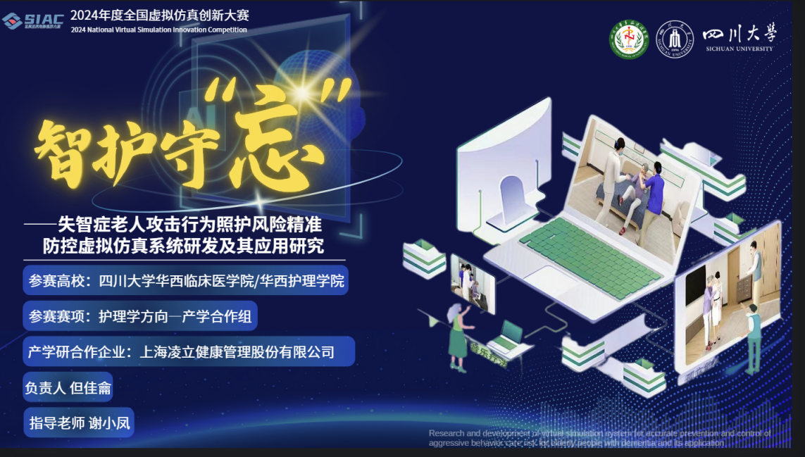 由我院谢小凤副教授为指导老师,21级护理学与管理学双学士学位本科生但佳龠为负责人,护理学院本科生何康乐、宋小红、刘碧瑶、唐宇4位同学参与,协同教育部产学研合作企业共同完成的项目《智护守“忘”—失智老人攻击行为照护风险精准防控虚拟仿真系统研发及其应用研究》项目,荣获医学仿真应用赛道护理学方向全国三等奖。