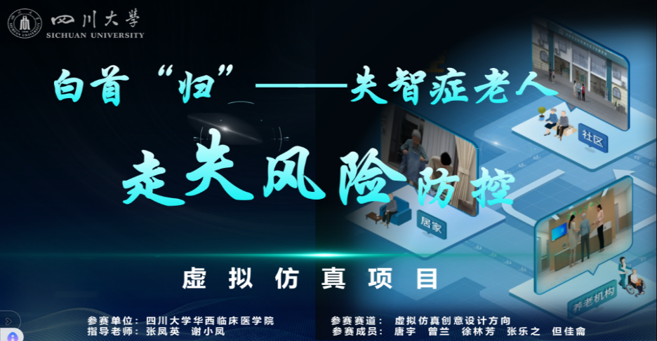 由我院张凤英教授、谢小凤副教授为指导老师,22级护理学与管理学双学士学位本科生唐宇为负责人,护理学院硕士研究生曾兰、徐林芳,本科生张乐之、但佳龠4位同学参与的项目《白首“归”—失智症老人走失风险虚拟仿真》,荣获仿真创新设计赛道全国二等奖。