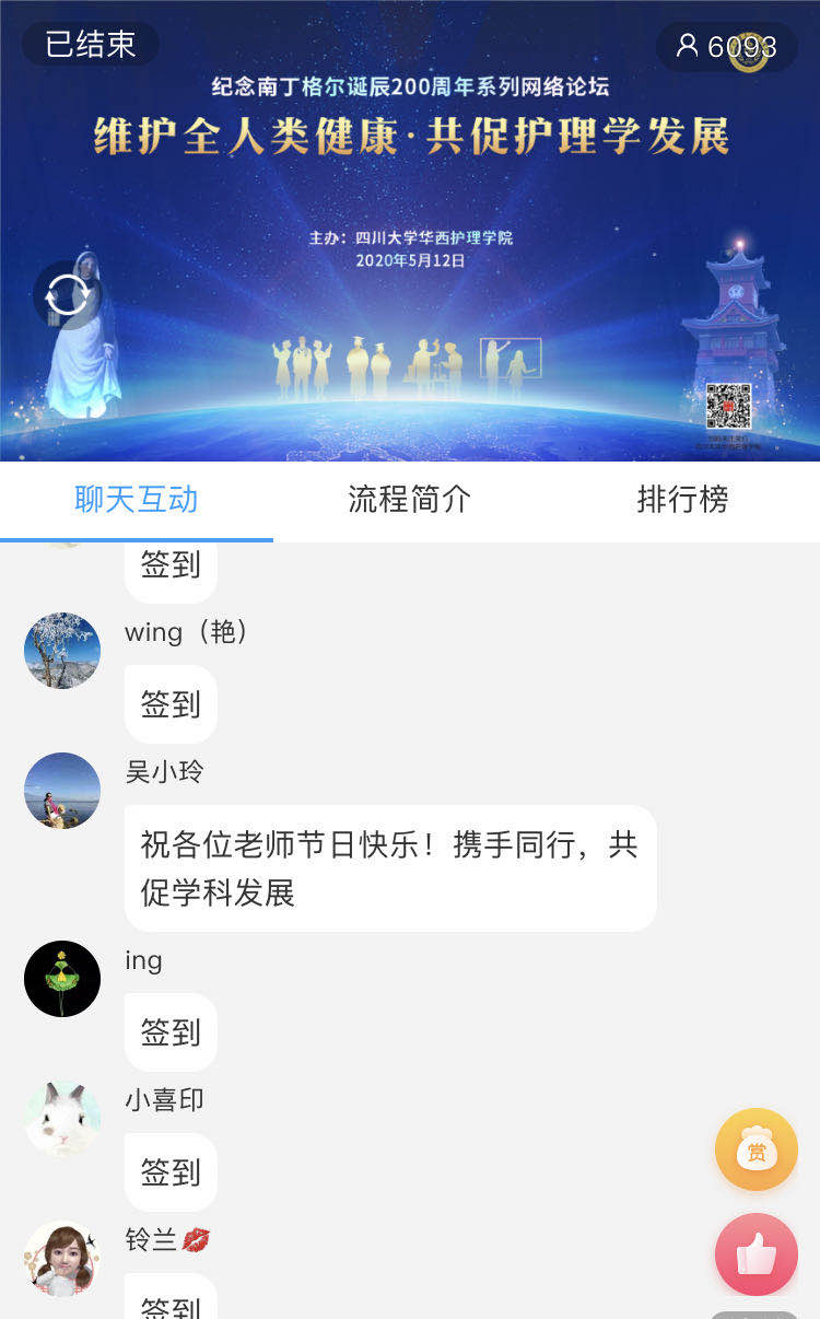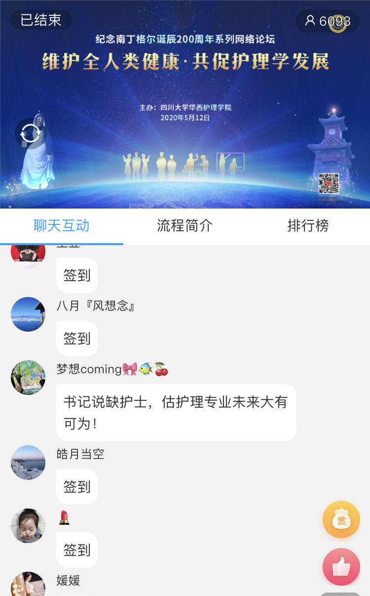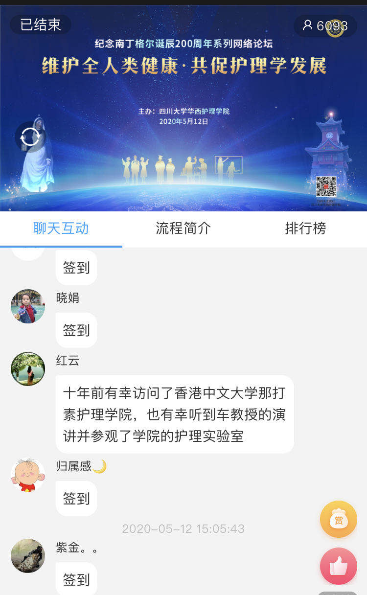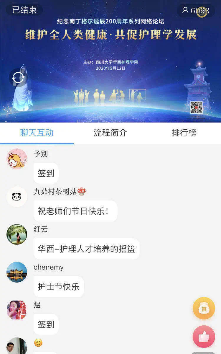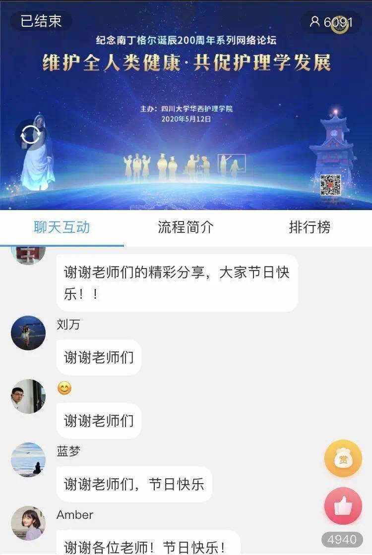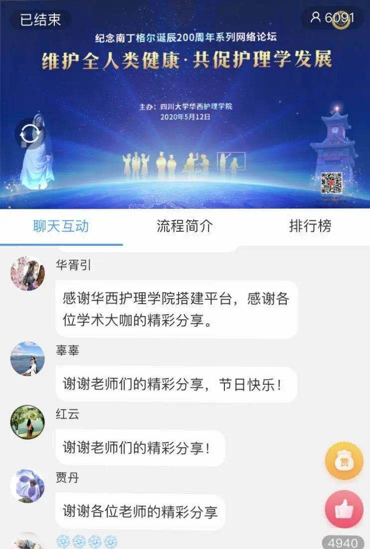 本次网络论坛有六千多人在线收看,覆盖全国23个省,100多所医院、高等院校及医疗服务机构,包括北京、上海、深圳及四川阿坝州、甘孜藏族自治州等偏远地区。与会者在网络平台留言,感谢护理学院搭建的交流平台,感谢学术大咖的精彩分享。