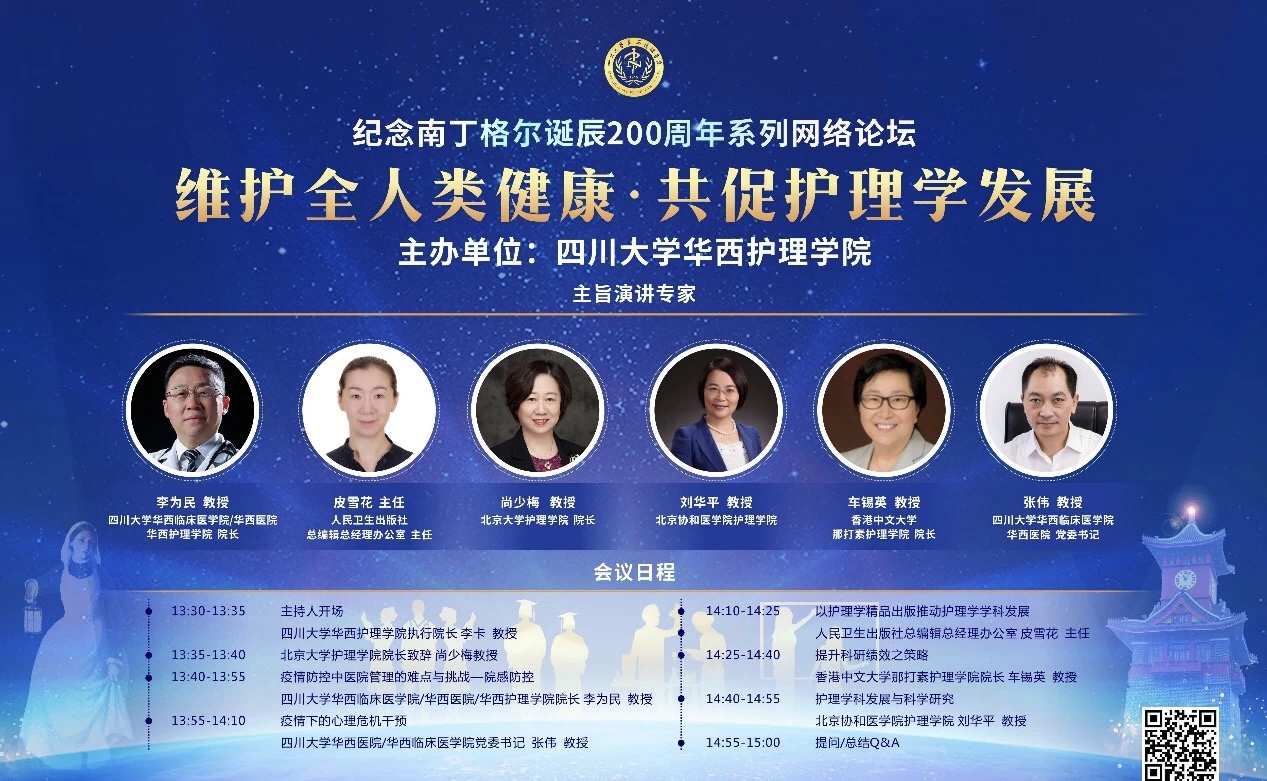 为纪念南丁格尔诞辰200周年,持续探索护理学科建设与发展,护理学院于5月12日下午在5G远程会议中心举办 “维护全人类健康,共促护理学发展”网络论坛。北京大学护理学院院长尚少梅教授、北京协和医学院护理学院刘华平教授、香港中文大学那打素护理学院车锡英教授、人民卫生出版社总编辑总经理办公室皮雪花主任、澳门理工大学殷磊教授、华西临床医学院/华西医院/金年会jinnianhuicom院长李为民教授和华西临床医学院/华西医院党委书记张伟教授作为嘉宾进行了主旨演讲。论坛由护理学院执行院长李卡教授和副院长张凤英副教授主持。