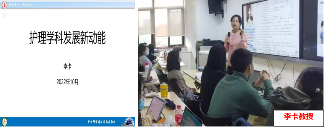 开课之初,护理学院院长、课程负责人李卡教授以《护理学科发展新动能》给同学们讲述了目前护理的发展瓶颈,为同学们介绍了护理学科的发展方向及未来前景。课程共同负责人李玲利教授对课程概况、团队、进度、目标、考核等内容作了详细介绍。