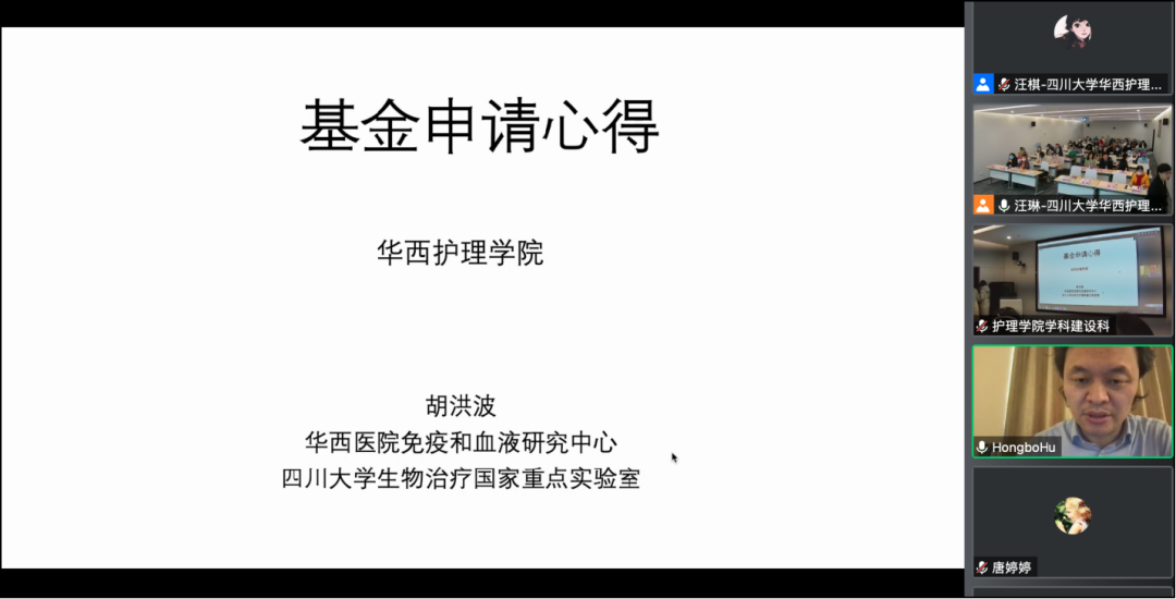 面上项目获得者谢小凤助理研究员从管理学的视角分享了个人申请“护理+”管理交叉学科国自然基金的宝贵经验。青年项目获得者洪瑞助理研究员围绕国自然青年基金撰写要点分享了护理学+材料学交叉研究课题的申报经验。