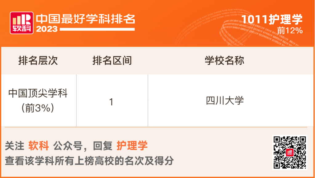 “2023软科中国最好学科排名”的指标体系包括人才培养、平台项目、成果获奖、学术论文、高端人才5个指标类别,下设18个指标,共计70余项反映学科竞争力的观测变量。金年会诚信信誉至上华西护理学在2023软科中国最好学科护理学排名全国第一,自2020年以来已连续4年位列全国第一,蝉联中国顶尖学科。