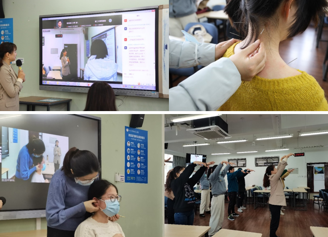 为了增加线上交流的互动性和趣味性,让同学们在轻松活泼的环境下获取中医知识,本次活动增加了很多实操环节,中西医结合科的医师和中医专科护士为肩颈痛、失眠的同学进行针灸、耳部按摩、耳穴贴压的现场治疗,还带着同学们一起打八段锦。