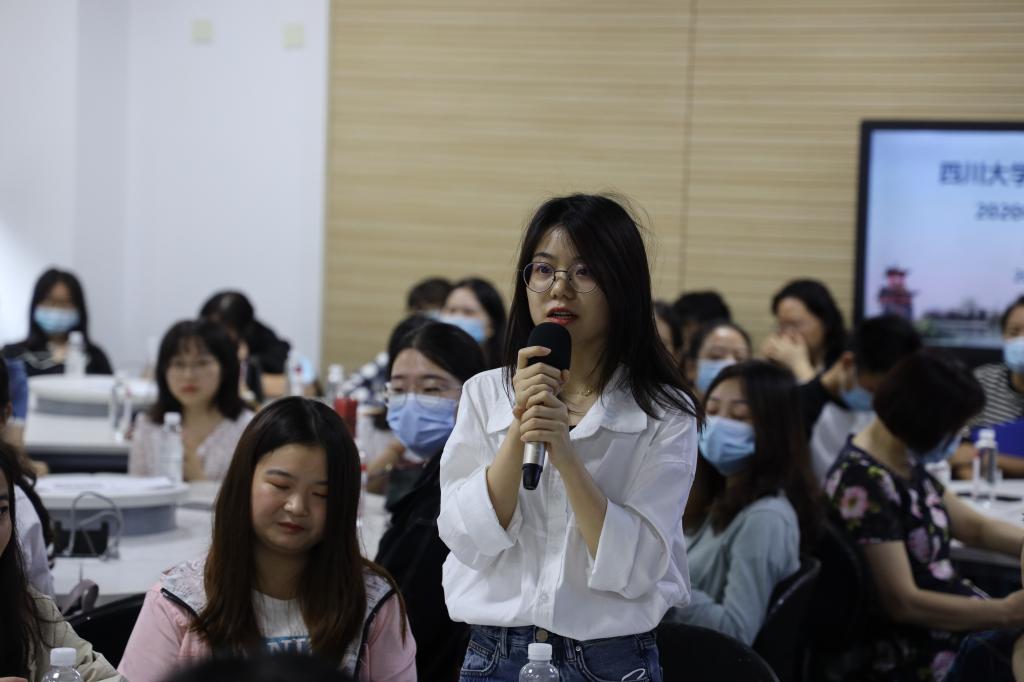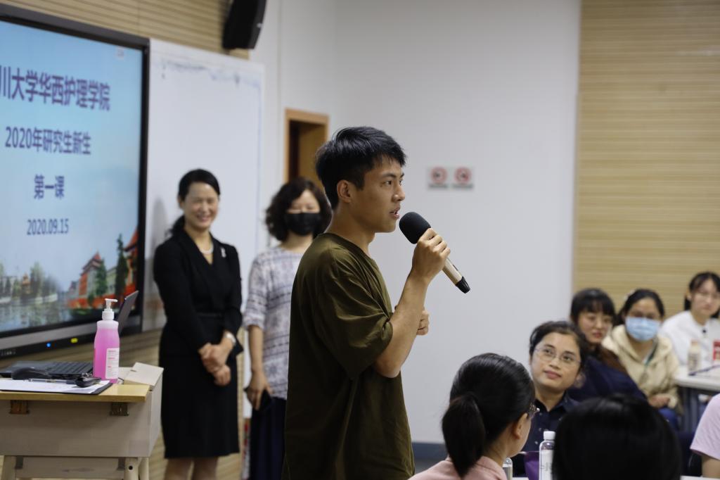 硕士研究生班主任刘常清进行学习经验分享。他讲到同学们要加强自主性和创新性,不仅在学术上学习老师的科学研究方法,更应在为人处事方面学习师者的德行。2020级博士生黄川雅代表新生作表态发言,她说作为学生应当自觉将川大华西文化融入进自己的一言一行中,为华西护理的发展贡献自己的一份力。