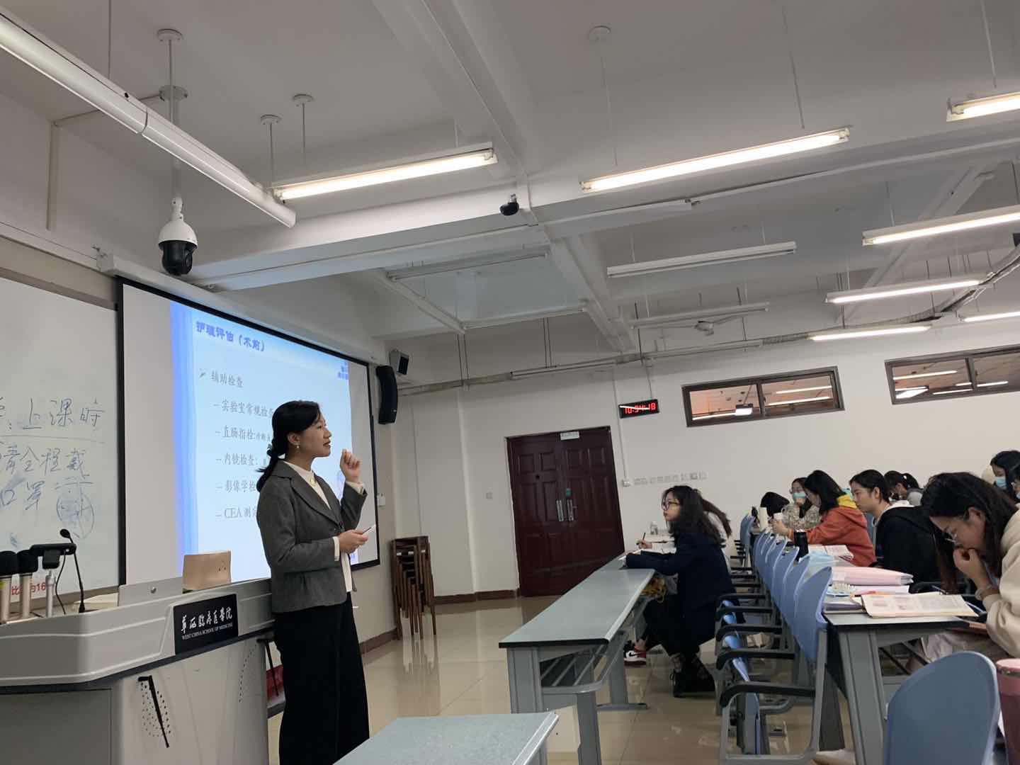 我们在十月中旬开始了阑尾炎、结直肠癌等部分的学习,记得李卡老师给我们上的第一堂课是肠梗阻,在课程开始前,李卡老师和我们谈了很多关于华西护理的过去和现在,更多的是关于华西护理的未来。李卡老师的讲话让我们 感受到了护理学科的发展前景,也对自己的专业有了更多的自信。李卡老师说:作为一名华西护理人,要有忠诚执着、追求真理、攻坚破难、朴质奉献的精神,走到哪里都要是护理行业的领军者。
