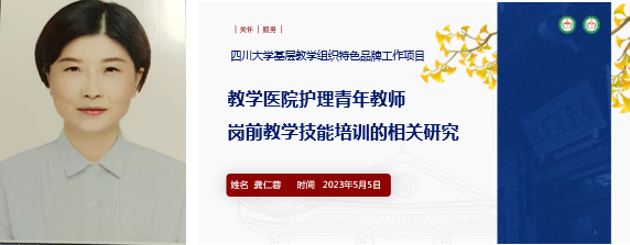 教研室主任龚仁蓉老师分享了《教学医院护理青年教师岗前教学技能培训的相关研究》将思政教育与专业知识有机融汇,设置返岗教研培训小组与课程,开展讲课比赛、以学促练、达成目标。为后期研究工作的顺利开展、外科护理学教研室青年教师的培训和发展奠定了基础。通过一系列调查和培训,使青年教师在职业素质、授课技能、专科知识、教学研究等方面快速成长,成为优秀的储备教师力量。
