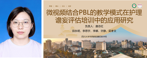 华西医院重症医学科李思宇老师结合急危重症护理学涉及多学科碎片化的知识、知识覆盖面广、难度大,不易理解掌握的特点,以谵妄评估为切入点,介绍了《微视频结合PBL的教学模式在护理本科生谵妄评估中的应用》的课题研究背景、项目举措与下一步研究计划。提出了团队继续强化临床教师和学员针对临床患者的谵妄评估能力,落实临床实践评估的期望。