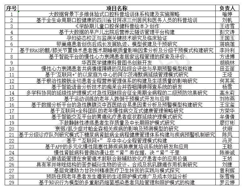 立项课题覆盖“互联网+护理”、围术期快速及舒适康复、口腔科普培训、老年慢病健康管理及风险预警、妇幼健康监测等重点研究领域。力促智慧健康医疗发展,建设健康中国,维护全生命周期健康。