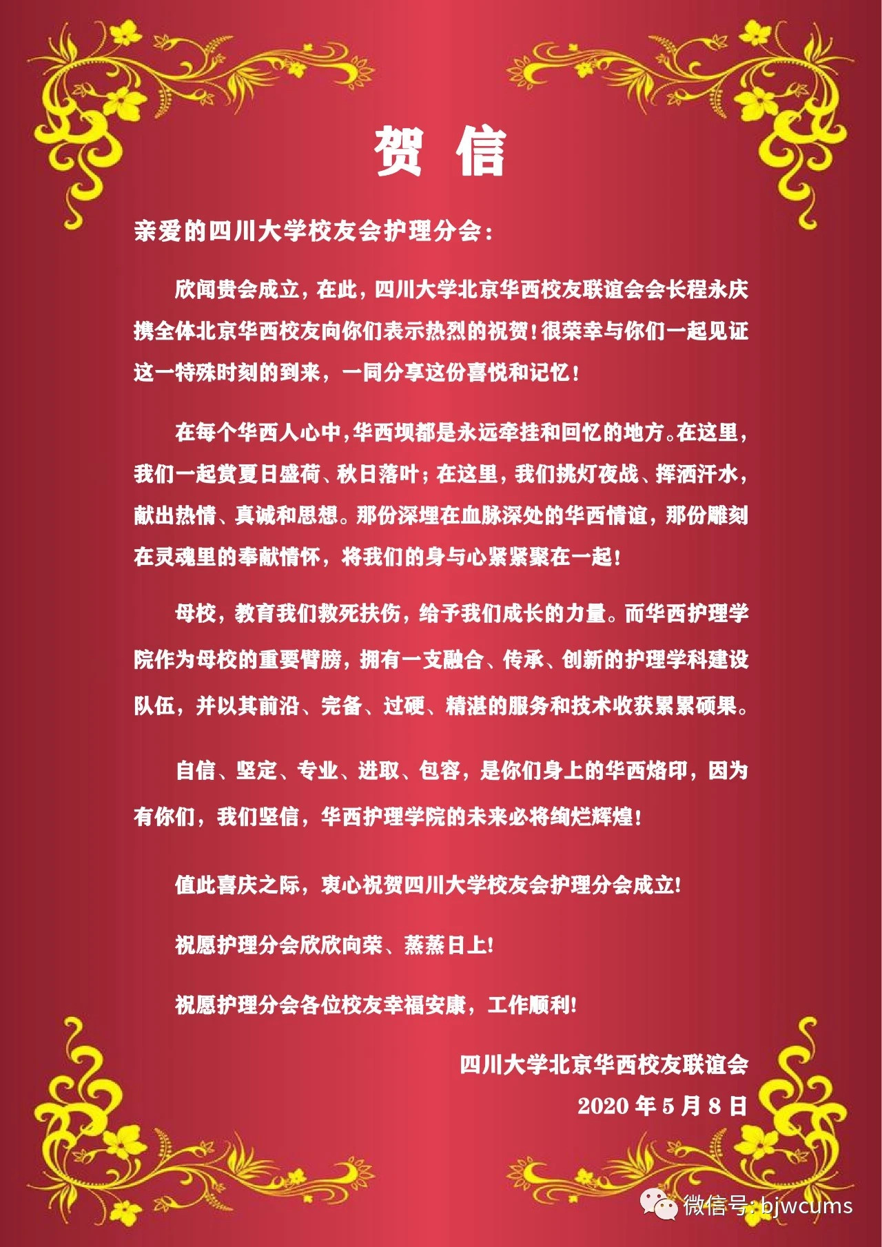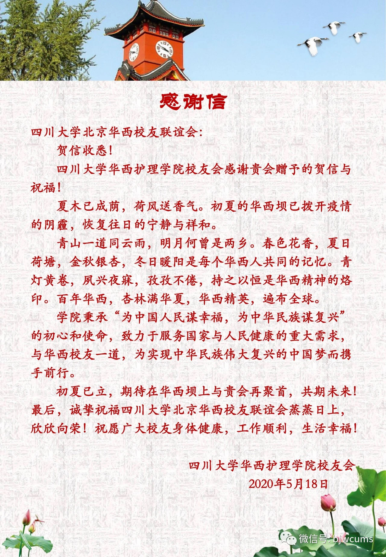 2020年4月30日,金年会诚信信誉至上校友总会批复成立金年会jinnianhuicom校友会,金年会诚信信誉至上北京华西校友联谊会代表在京校友于5月8日发去贺信;5月18日,北京华西校友联谊会收到金年会jinnianhuicom校友会发回的感谢信。