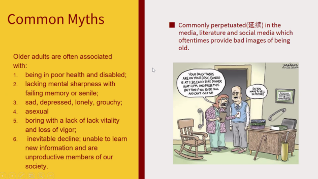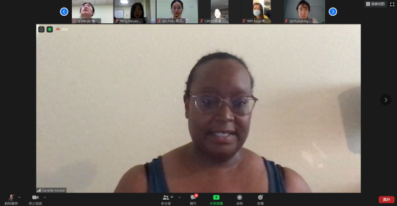 然后,Johannah Uriri-Glover老师向大家就与老年人交流的技巧、两国老龄化问题、对于衰老的误区和态度、常见的老年综合症和评估等进行了更加详细的介绍。中美两国的同学就老龄问题以及相关案例进行了讨论和汇报。