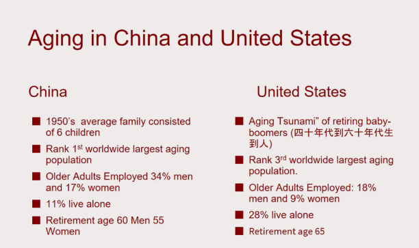 课程开始,首先由Johannah Uriri-Glover博士向所有学生讲解课前须知,帮助学生初步了解中美老龄化现状及问题。