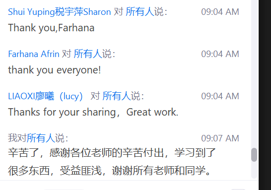 同学们对此次课程的双方院校、老师、工作人员及同学都表达了真挚的感谢。课程虽然结束,但双方的友谊和对老年护理行业的情怀依然炙热,期待共同致力于老年护理事业的探索和实践,用大家的智慧和努力共同助力护理事业的发展。