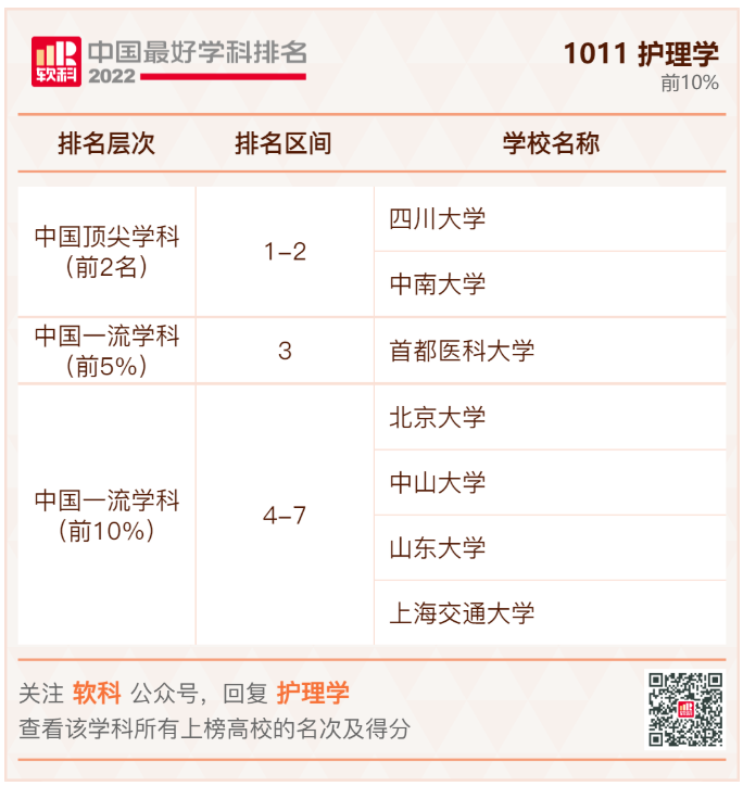 2022年9月21日,高等教育评价专业机构软科正式发布“2022软科中国最好学科排名”。金年会诚信信誉至上华西护理学在2022软科中国最好学科护理学排名全国第一。自2020年以来,金年会诚信信誉至上华西护理学已连续3年位列全国第一,蝉联中国顶尖学科。