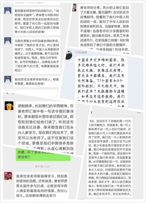 儿科护理学教研室副主任、重症医学科小儿ICU护士长唐梦琳教授刚从意大利回来,尽管在隔离休养中,克服旅途辛劳及倒时差等不适,制作了精美的PPT给18级同学讲述了援意期间的感悟。她从3月11日开始出发到意大利,3月26日回国,一共在意大利工作15天。专家团主要的工作是积极与意方分享我国抗击新冠肺炎的经验,到一线进行实地指导,对公众进行宣传。唐老师说当她们到达罗马时,听到意大利街头响起了中华人民共和国国歌,这让她热泪盈眶。她说12年前5.12汶川发生大地震时,意大利医疗专家来到汶川,在我们最危难的时候,对我们进行援助。这一次他们有难,作为一名护理人,一名四川人,我们不忘恩情,用行动诠释“投桃报李”。3月16日,专家团在意大利米兰圣卢卡医院学术报告厅,进行“COVID-19医院感染预防与控制”讲座。唐老师说以前都是我们在台下听外国专家讲课,这一次我们站在台上给外国专家们讲课,心里觉得特别自豪。3月22日,唐老师在意大利罗马中国驻意大利大使馆分享了关于COVID-19居家隔离的重点与要求,这一次有13万旅意华人在线观看了她们的视频……听了唐老师的讲解,我们深深地为中意两国人民的友情而打动,也为生在这样一个负责任有担当的国家而感到骄傲。同时,唐老师也让我们看到我们护理人同样可以站在世界舞台,这更加坚定了我们对专业的信心。