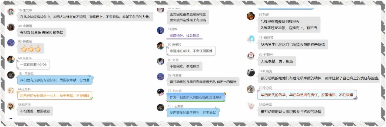 疫情仍在全球蔓延,我们还不能开学,师生之间仍不得相见,网络课程还在持续进行中,但还好一路上一直都有人在不断感动和激励着我们。3月30日的《护理伦理学》课内容十分丰富。课前,老师首先组织同学们观看“提南丁格尔之灯” 思政微课-华西人永不缺席。无论是汶川、雅安地震,还是今天抗击新冠肺炎疫情,或者是扶贫攻坚战都有我们华西人的身影,今天是前辈们,明天将会是我们……