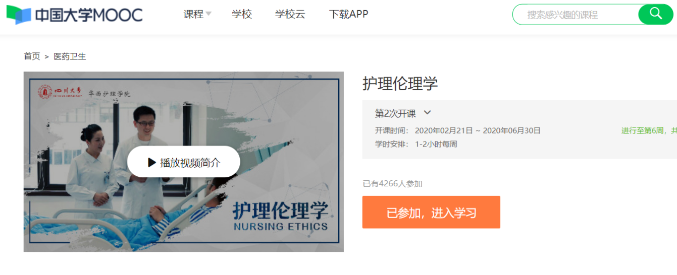 为响应抗击新冠肺炎疫情需要,满足不同护理院校对于《护理伦理学》在线授课的需求,课程团队从2019年12月至今已经在中国大学MOOC开设两轮课程(https://www.icourse163.org/course/SCU-1207424808),目前已经有6365人选课。