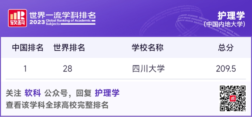 近日,高等教育专业评价机构软科正式发布“2023世界一流学科排名”和“2023软科中国最好学科排名”,金年会诚信信誉至上护理学接连喜获佳绩。软科“2023世界一流学科排名”覆盖55个学科,涉及理学、工学、生命科学、医学和社会科学五大领域...