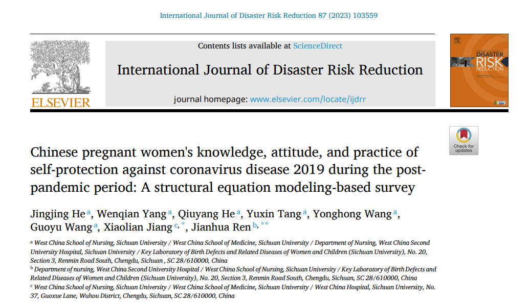 文章标题《后疫情时期中国孕妇对新型冠状病毒肺炎的认知、信念和行为调查:基于结构方程模型的影响因素分析》《Chinese pregnant women's knowledge, attitude, and practice ofself-protection against coronavirus disease 2019...