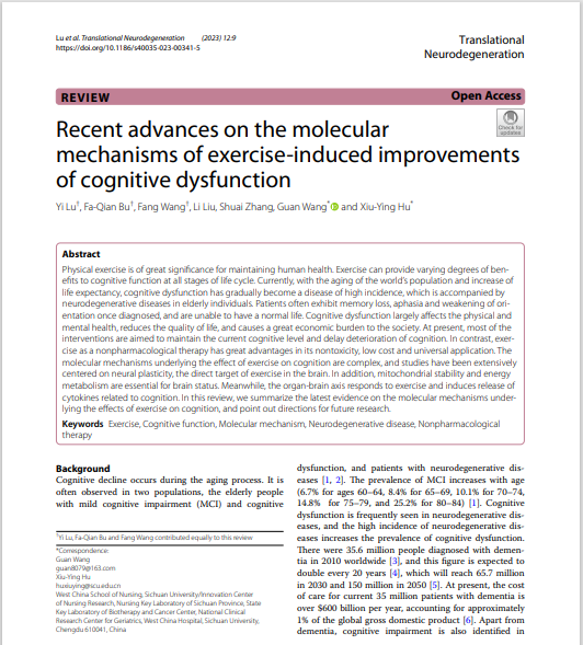 文章标题《运动改善认知功能障碍分子机制的研究进展》《Recent advances on the molecular mechanisms of exercise-induced improvements of cognitive dysfunction》文章发表情况介绍该文章由金年会jinnianhuicom2021级硕士生路...