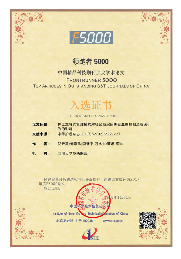 2018年11月,国家科技部中国科学技术信息研究所发布了2018年度“领跑者5000-中国精品科技期刊顶尖学术论文”(简称F5000)名录。我院2013级护理硕士研究生倪云霞(导师刘素珍教授)毕业课题研究成果之一《护士主导的管理模式对社...