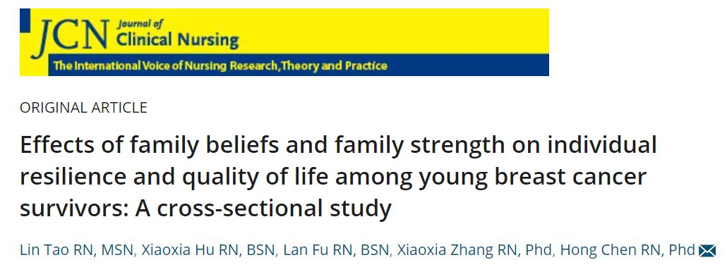 文章标题《家庭信念和家庭力量对年轻乳腺癌幸存者个人复原力和生活质量的影响》《Effects of family beliefs and family strength on individual resilience and quality of life among young breast cancer survivors: A cross-s...