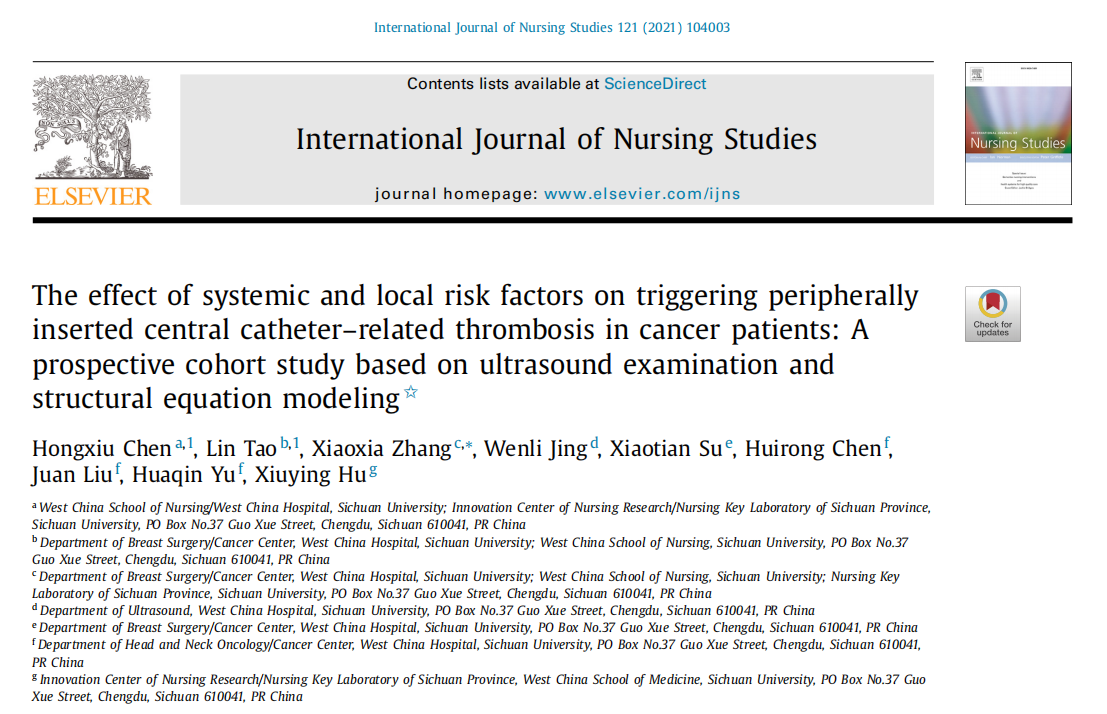 文章标题《系统性与局部性危险因素引发肿瘤患者PICC血栓的作用效应:一项基于超声检测和结构方程模型的前瞻性队列研究》《The effect of systemic and local risk factors on triggering peripherally inserted central catheter...