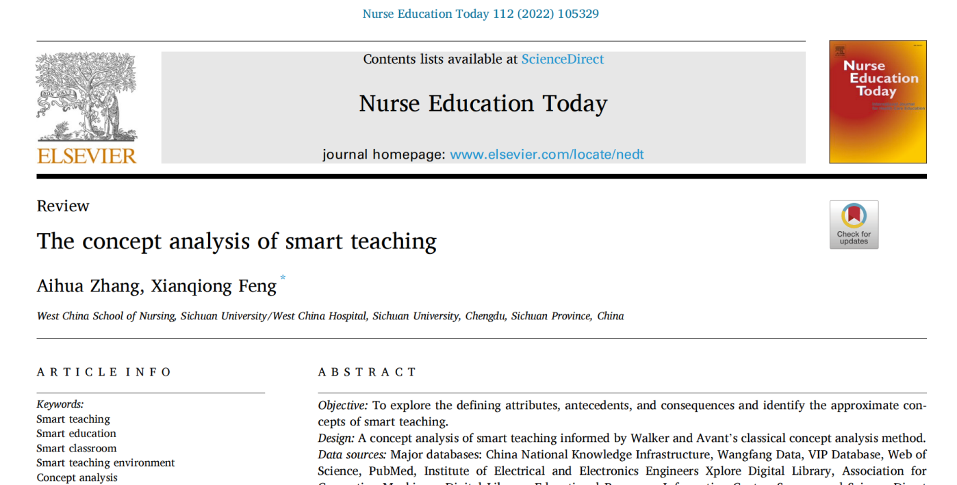 文章标题《智慧教学概念分析》《The concept analysis of smart teaching》文章发表情况介绍该文章由金年会jinnianhuicom硕士研究生张爱华为第一作者、冯先琼教授为通讯作者完成,于2022年5月在Nurse Education Today(影响因子...